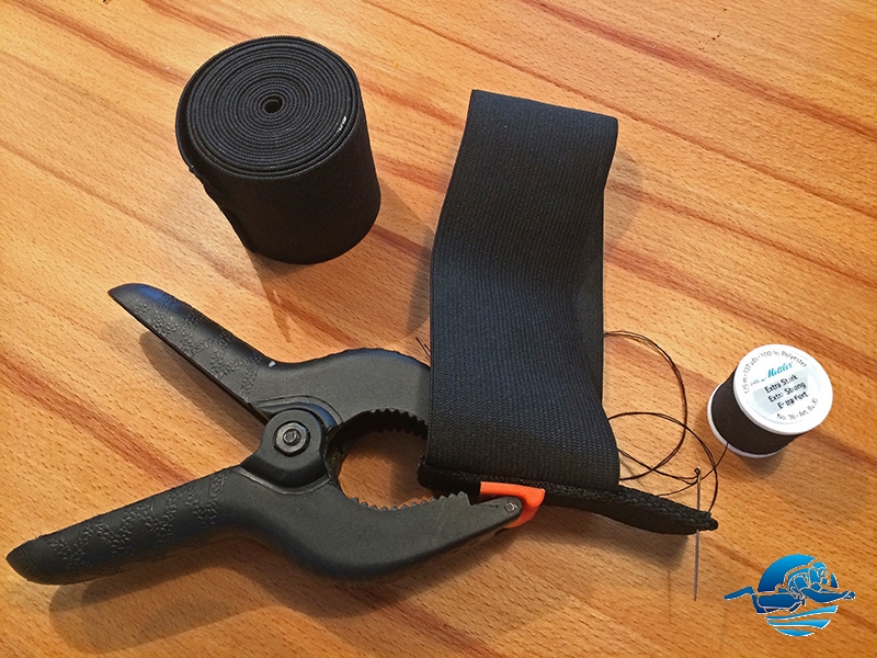 Ca 5 cm breites elastisches Band, ca. 2.5 cm breites Nylon Gurtband und Polyester-Faden extra stark. Gibts alles im Nähladen. Lasche 3-lagig umgeklappt und alles sauber vernähen.